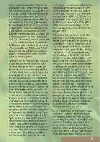 Nach dem Zweiten Weltkrieg gab es für die bildenden Künstler eine besondere Blüte- zeit. In den kriegsführenden Ländern, vor allem in Deutschland, waren viele Kirchen zerstört und mit ihnen unwiederbringliches Kunst- und Kulturgut innerhalb der theolo- gischen Verkündigungen und Botschaften. Nun wurde es die avantgardistische Kunst in der zweiten Hälfte des 20. Jahrhunderts die sich nicht mehr primär am Gegenständ- lichen informierte sondern abstrakt in den Gotteshäusern die wesentlichsten sakralen Inhalte der einzelnen Konfessionen beein- druckend in Farben und Formen interpretier- ten und die architektonischen Innenräume zum Gesamtkunstwerk christlicher Prägung werden ließen. Kunst im Kirchenraum ist weitgehend anderen Gesetzen unterworfen als die sogenannte freie Gestaltung. Sie ist nicht ohne weiteres herauslösbar aus der Synthese des gegebenen Ortes in einheit- licher Verbindung mit dem Raum und der Liturgie. Denn letztlich schöpft die sakrale Kunst hieraus ihre genuine (unverfälschte) Kraft. Und diese dürfte nur im Kirchenraum erlebbar sein. Dieser Erkenntnis stellten sich immer wieder – zum Glück auch in