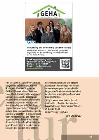 des Kreises Mettmann. Die passend satirischen Illustrationen von Jürgen Scheidtsteger gehen mit den Erzäh- lungen eine Symbiose ein und erheben das Buch zu einem kleinen Kunstwerk. Breit empfohlen: