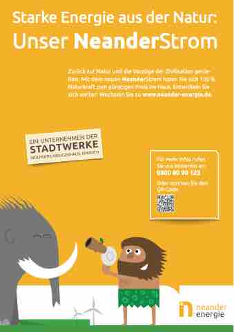 Zurück zur Natur und die Vorzüge der Zivilisation genie- ßen: Mit dem neuen NeanderStrom holen Sie sich 100 % Naturkraft zum günstigen Preis ins Haus. Entwickeln Sie sich weiter: Wechseln Sie zu www.neander-energie.de.
